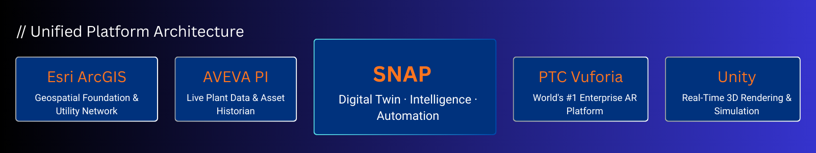 By natively integrating Esri's geospatial foundation, AVEVA's live operational data, Vuforia's world-leading AR, and Unity's physics-accurate simulation, SNAP delivers the full industrial intelligence stack in a single, deployable platform.