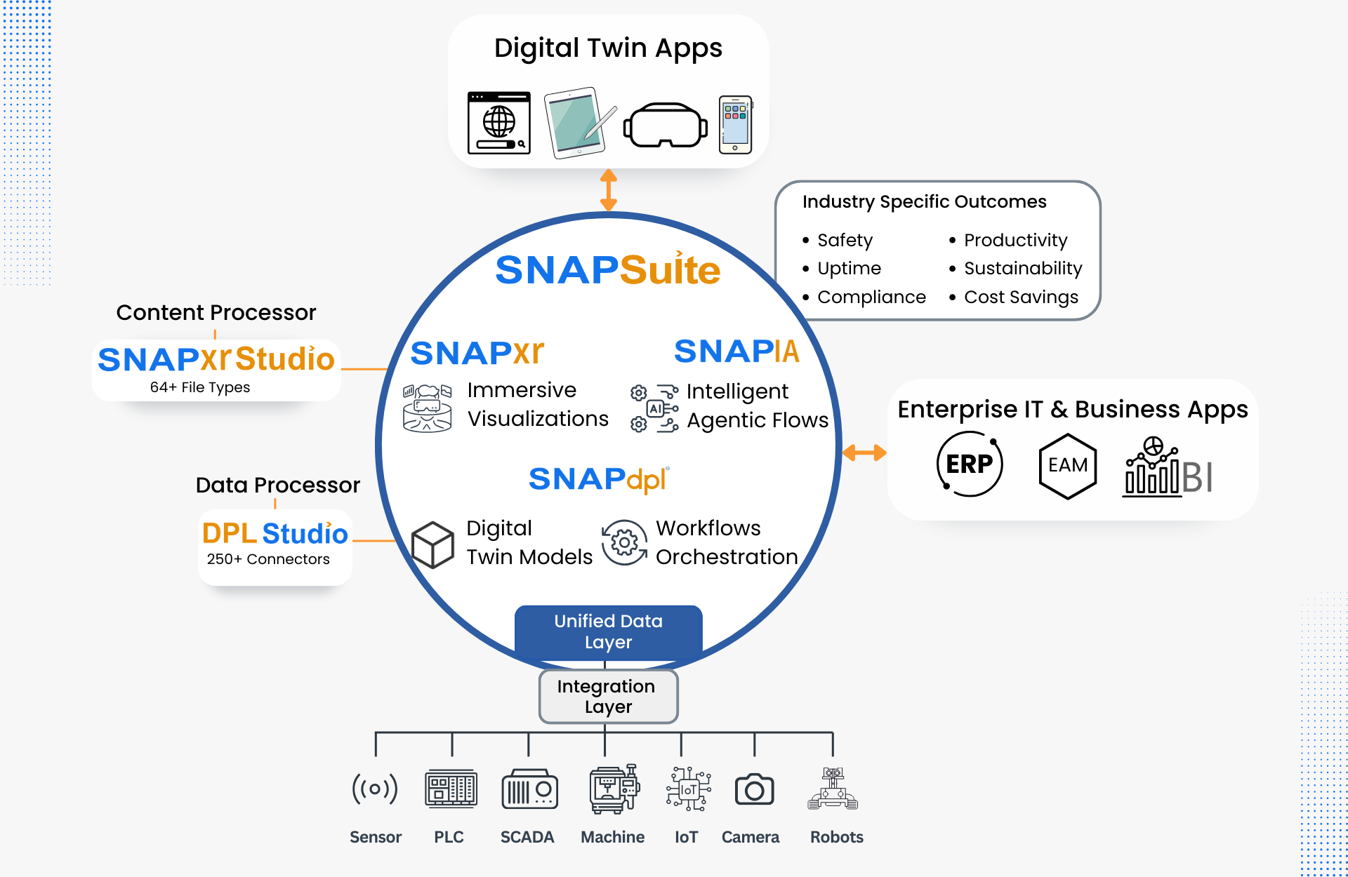 SNAP Suite is an enterprise-grade platform driving digital transformation through a seamlessly integrated architecture that combines immersive visualization (SNAPxr), intelligent automation (SNAPIA), and extensible logic design (SNAPdpl).